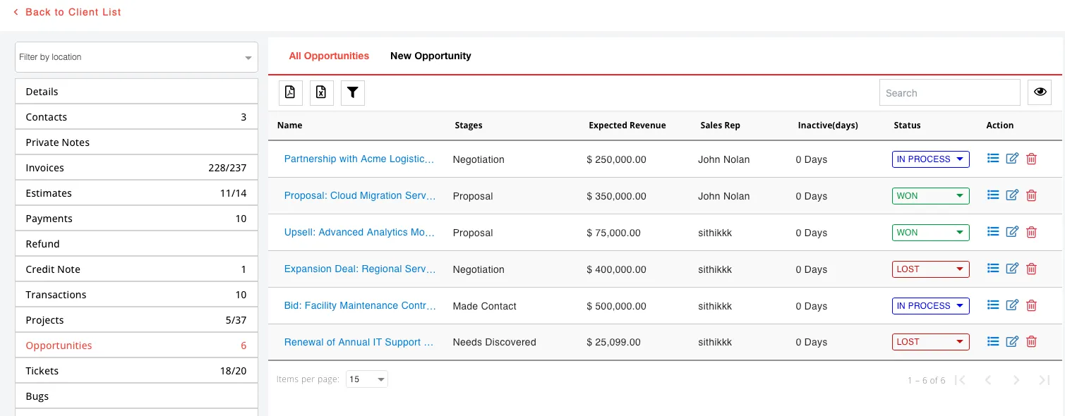 When a sales opportunity closes, it automatically becomes a client record with full history. Projects link to clients, invoices tie to projects, and support tickets connect to everything. Your team never re-enters data or loses context when switching between systems. Client management isn’t a separate tool it’s the heart of your entire operation, connected to sales, projects, accounting, and support. That unified approach is what makes Utiliko different.